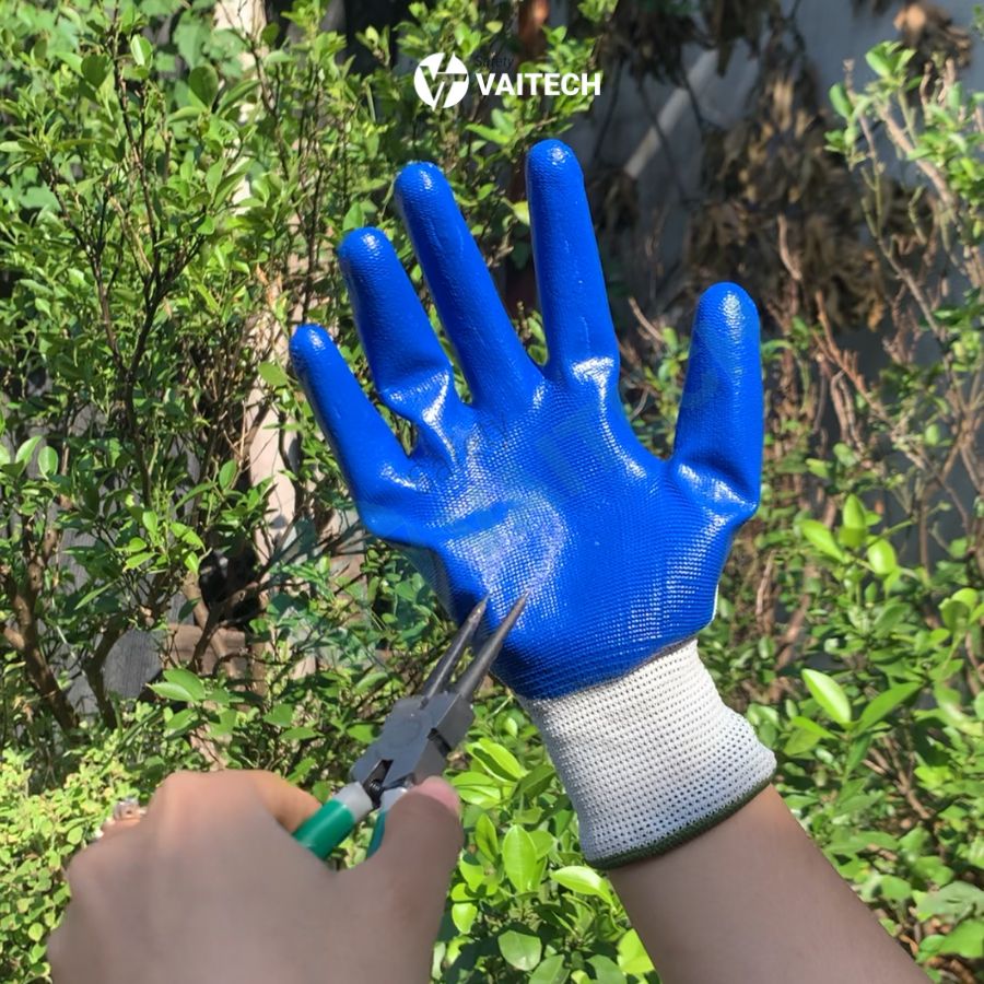 - Phủ sơn xanh chống trơn trượt hiệu quả: Lòng bàn tay và các ngón tay được phủ lớp sơn xanh dương, tạo độ bám chắc chắn khi thao tác, ngăn ngừa tình trạng trơn trượt khi tiếp xúc với bề mặt trơn láng hoặc vật liệu khó cầm nắm.