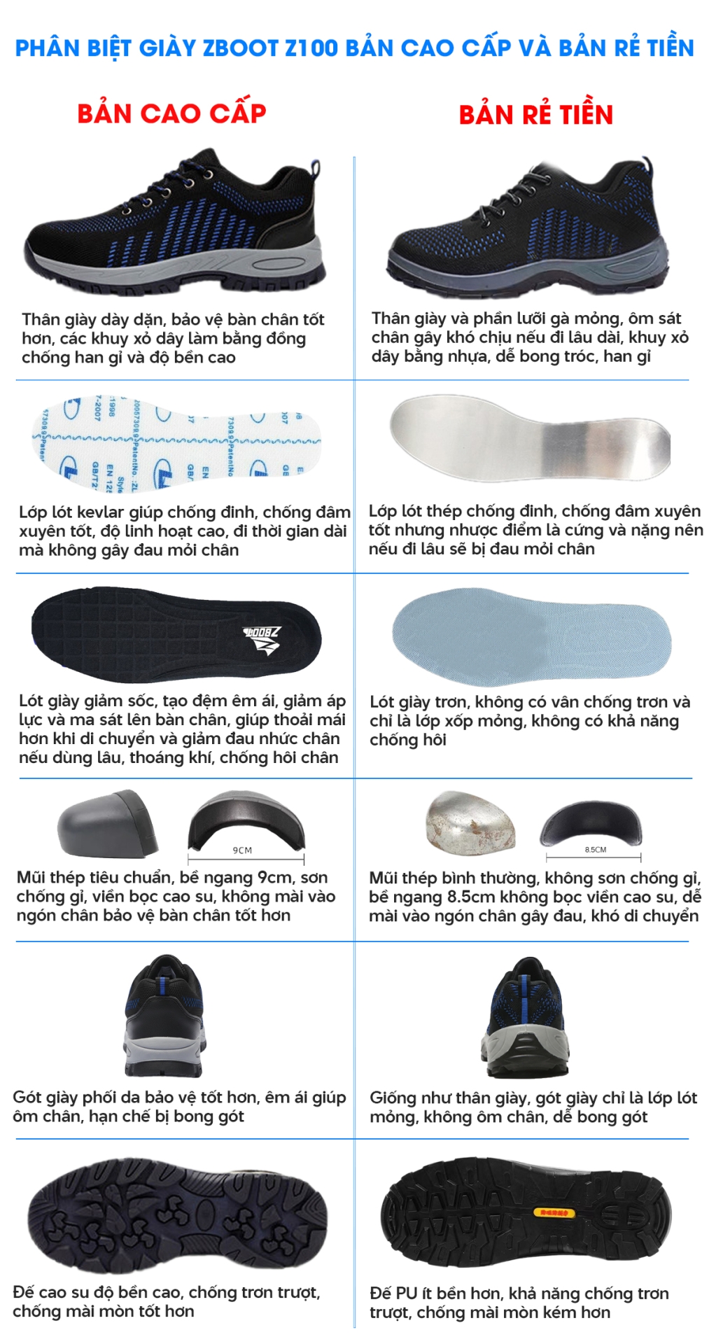 Hiện nay trên thị trường xuất hiện nhiều mẫu giày với kiểu dáng tương tự Zboot Z100 nhưng với giá thành rẻ, chất lượng không tương xứng dễ làm quý khách nhầm lẫn. Bảo hộ An Việt đưa ra cách phân biệt Zboot Z100 bản cao cấp và bản giá rẻ để quý khách lưu ý, lựa chọn đúng sản phẩm chất lượng, bảo vệ hiệu quả.